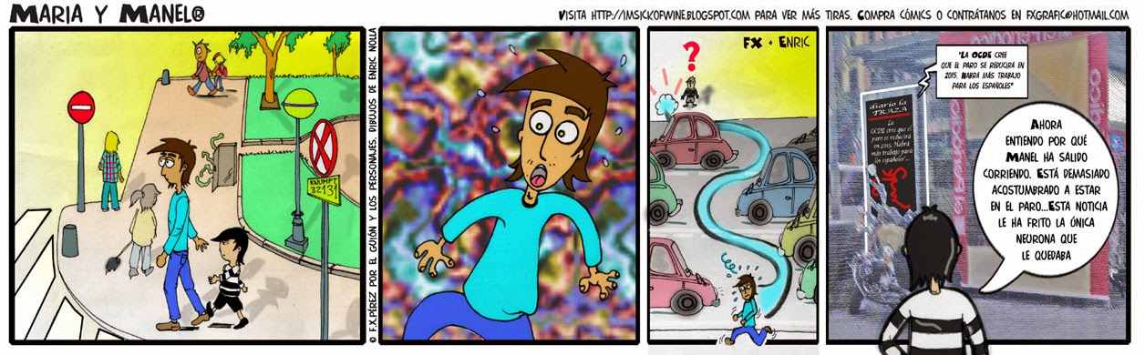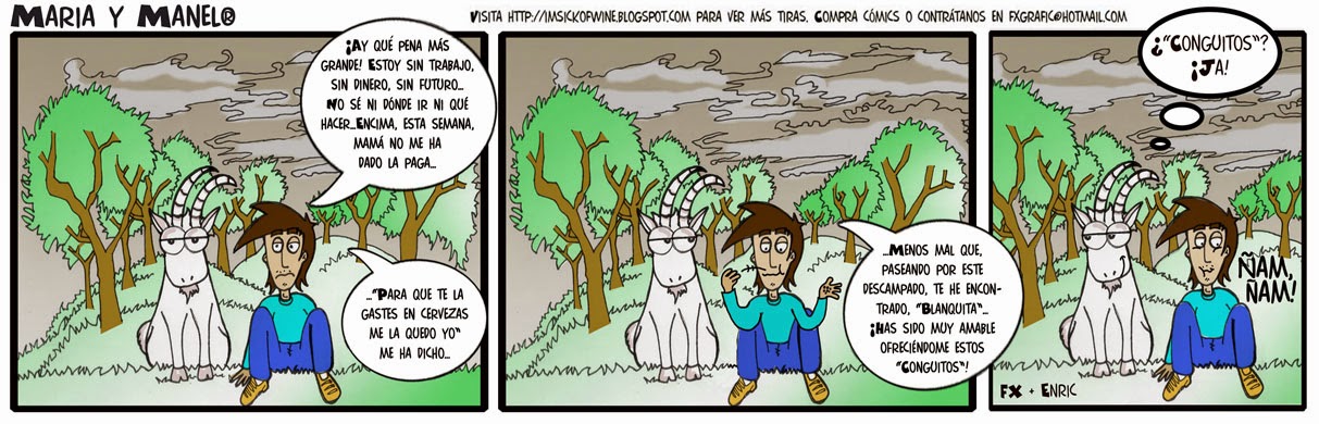 ...Pero Manel parece habérselos creído. Divertida tira cómica de FX (guión) y Enric Nolla (dibujos).